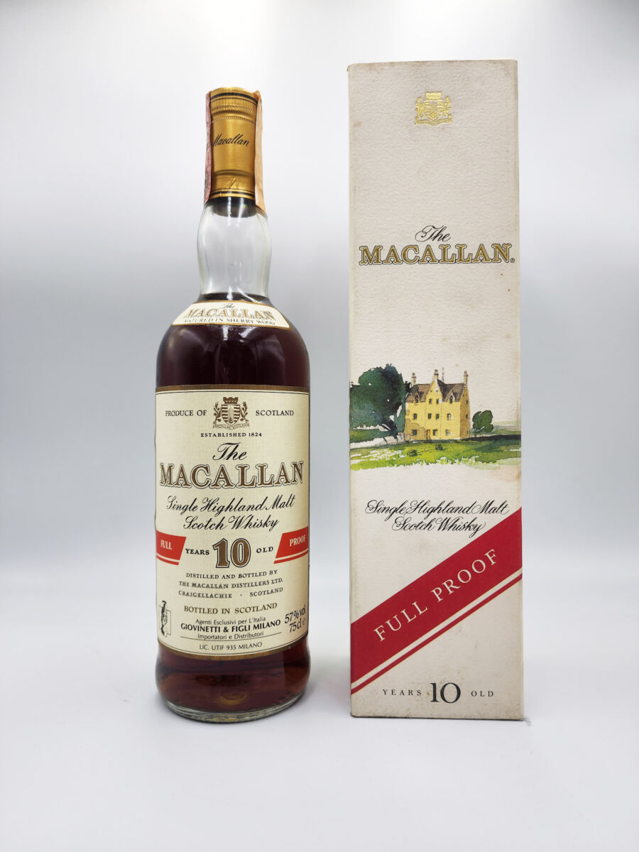 Macallan 10-Year-Old Cask Strength Giovinetti Import. Macallan 10-year-old Sherry at Cask Strength bottled in the 1980s for Giovinetti & Figli (Italian market). Very big sherry notes like dates, plums, and raisins and a full-flavored palate at 57%. It is an incredibly balanced whisky with no burn but a classy, elegant, rich old-school sherried Macallan.