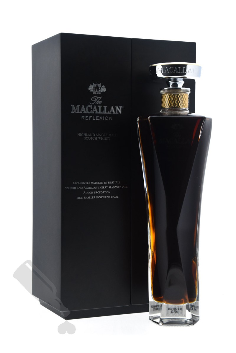 Macallan Reflexion. Part of The Macallan Masters Decanter Series created to showcase the beautiful range of The Macallan’s natural color, Reflexion embodies the foremost influence of first fill sherry seasoned oak casks. This whisky’s deep red mahogany hue, taken directly from the cask, is enhanced by the angular facets of the carefully crafted decanter that each reflect the light to showcase the depth of colour.